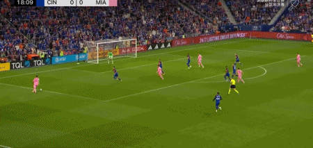 第19分钟,梅西分球边路,西尔维蒂左路传中,梅西跟上头球破门!迈阿密国际1-0领先辛辛那提