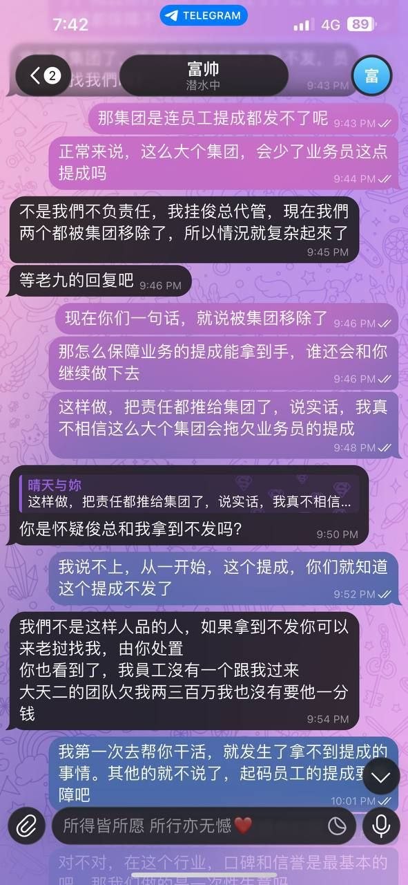 我们只希望可以拿回属于自己的钱,我们3个人总的提成5万U,想知道这个提成什么时候发,如果是集团已经发请出来面对一下。